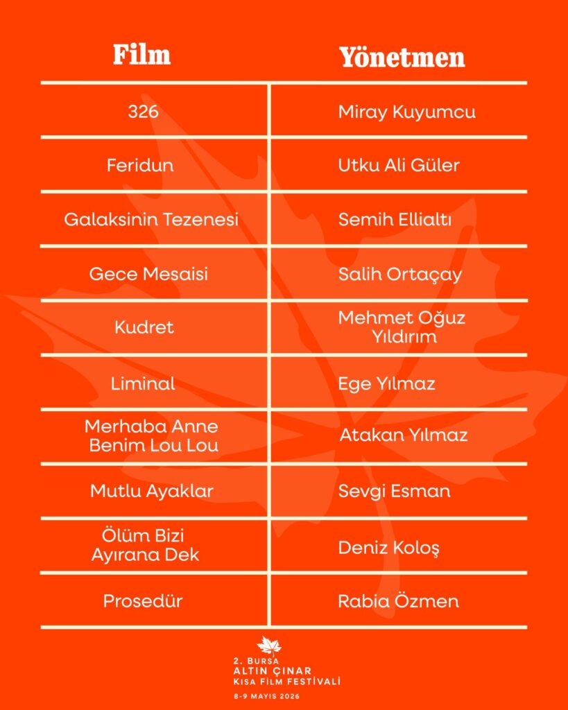 Ayrıca festival öncesinde 5–7 Mayıs 2026 tarihlerinde Mudanya Üniversitesi’nde öğrencilere yönelik özel film gösterimleri düzenlenecek. Böylece 2. Bursa Altın Çınar Kısa Film Festivali, beş güne yayılan programıyla sinemaseverleri ve genç üreticileri bir araya getirecek.