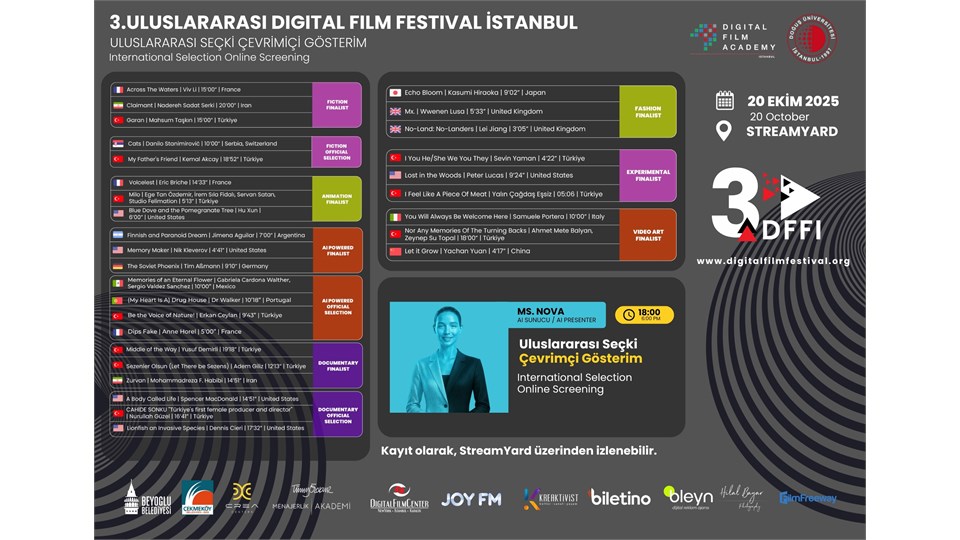 Uluslararası Digital Film Festival İstanbul, bu yıl 18-21 Ekim tarihleri arasında sinemaseverlerle buluşuyor. Sinemadaki dijital dönüşümü odağına alan festival, İstanbul’un farklı mekanlarında dünyanın dört bir yanından yaratıcı yönetmenlerin imzasını taşıyan ücretsiz film gösterimleriyle bağımsız sinemanın seçkin örneklerini izleyiciyle buluşturacak.